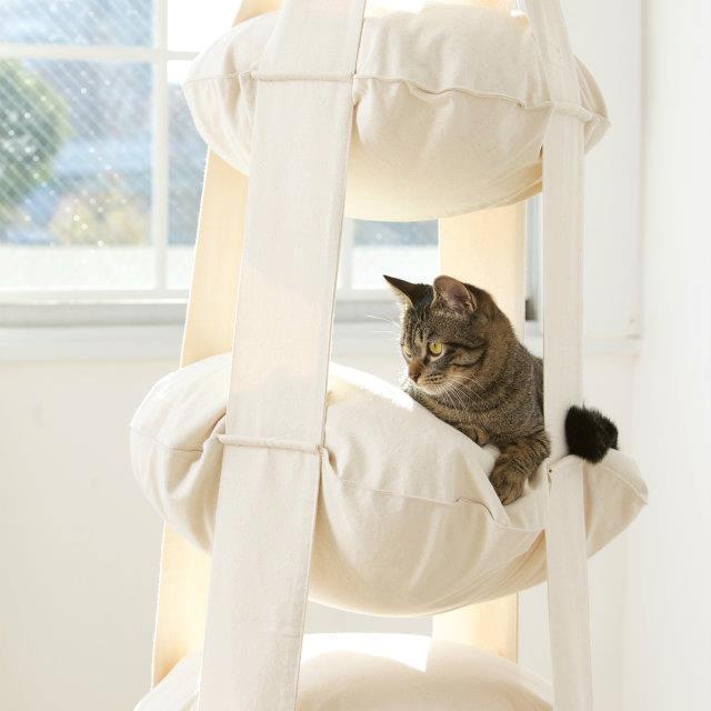 Ook voor de rustige kat is de trapeze een uitstekende plek om te vertoeven: hoog boven alles verheven slapen op één van de kussens of lekker opgerold en verstopt blijven in het hangmatje.