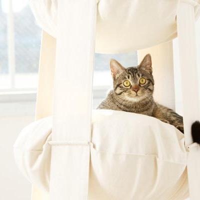 Ook voor de rustige kat is de trapeze een uitstekende plek om te vertoeven: hoog boven alles verheven slapen op één van de kussens of lekker opgerold en verstopt blijven in het hangmatje.